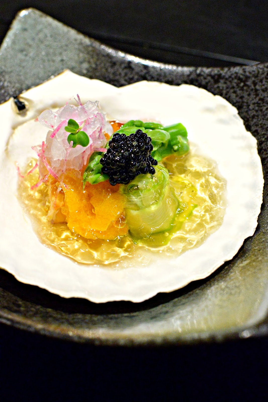 在灣仔的高級日本餐廳吟彩Gin Sai,繼上月推出櫻花餐單後,今個月就推出夏日海鮮餐單,選用多款時令海鮮,造出各道美味菜式。前菜先有Smoked Scallop,Caviar,Asparagus with Egg Yolk Vinegar & Dashi Jelly,帶子煙燻味道很濃,肉質嫩而不韌,跟上魚子醬及爽脆的露筍,淋上蛋黃醋及啫喱,酸酸的,感覺清新開胃。