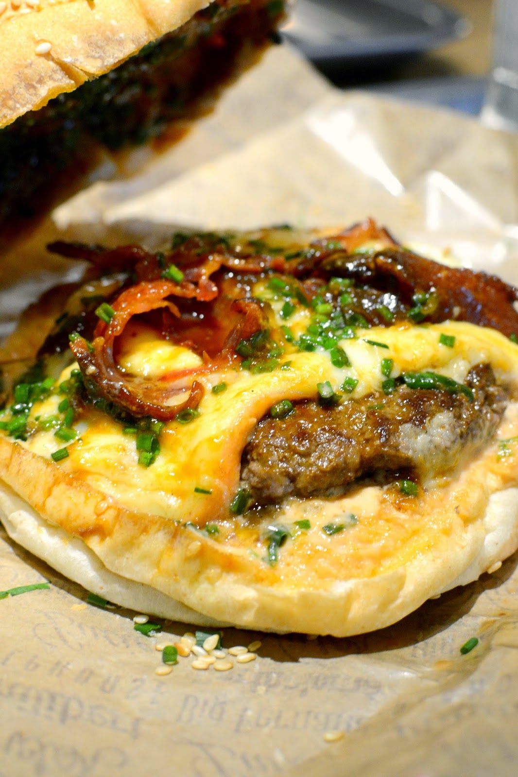 Le Victor,Veal Burger with Fourme d’Ambert Cheese ,Caramelised Onions,Coriander & Home-made Sweet Mayonnaise Sauce,HK$130,半熟的小牛肉配藍芝士及焦糖洋葱,芝士味道比牛肉漢堡濃得多,喜歡吃藍芝士的話就可選這款。