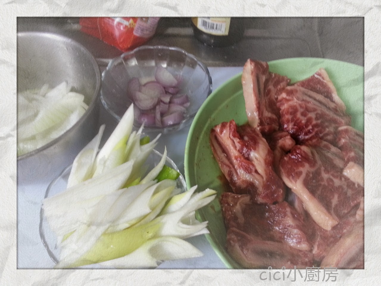 1. 牛仔骨解凍後, 用廚房紙吸乾水分, 加入醃料醃30分鐘.
