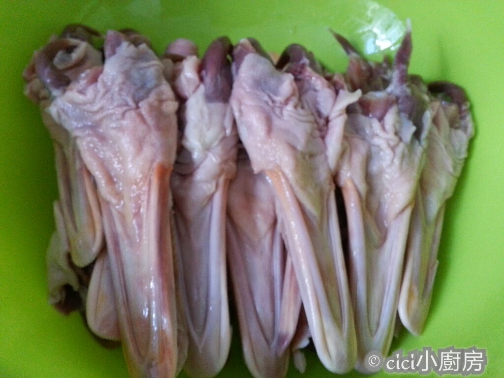 1. 鴨下巴洗淨, 加入醃料醃30分鐘, 備用.
