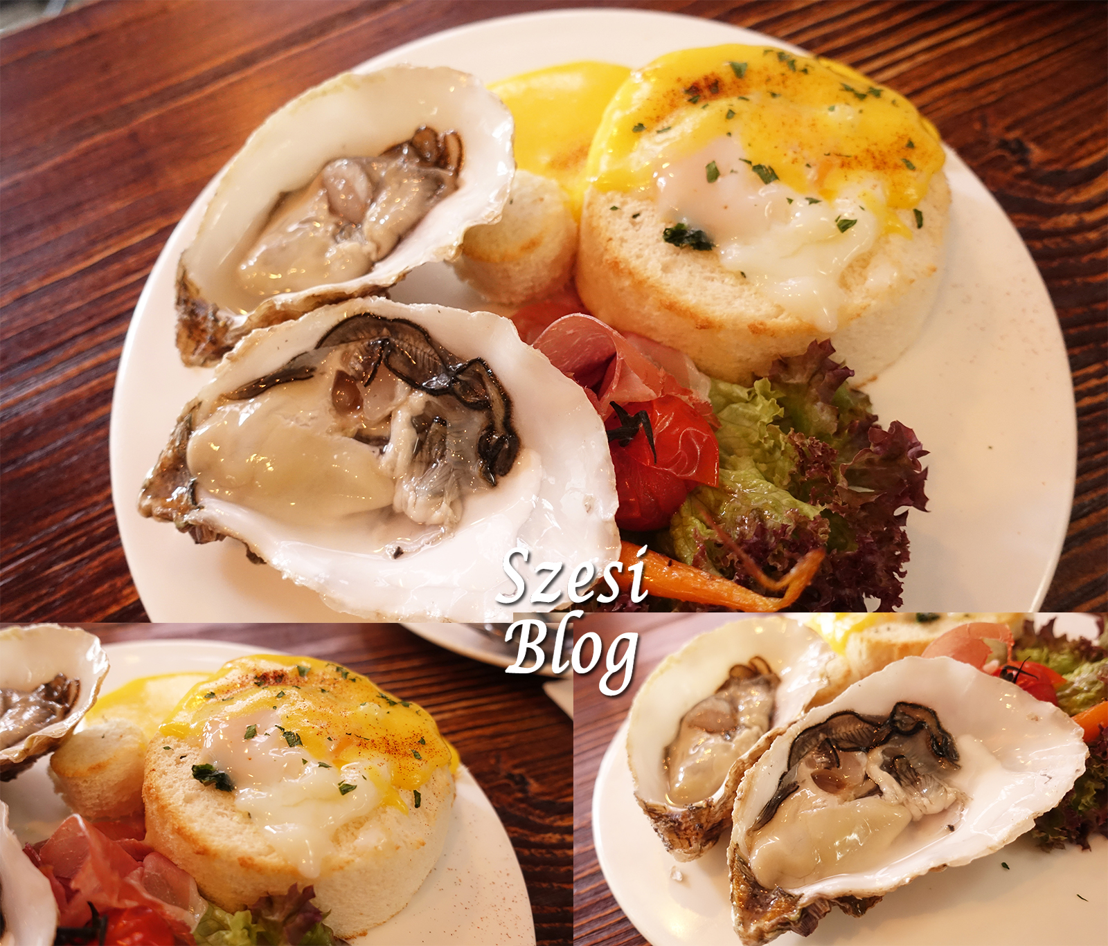 這道菜是吸睛的就是震騰騰的流心蛋,底下是圓形的厚方包,旁邊有翠綠的雜菜沙律及巴馬火腿,更有兩隻漲卜卜的生蠔。