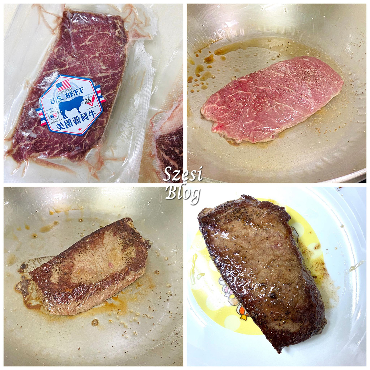 先將牛扒取出來解凍(煮食前十五分鐘把牛扒從雪櫃中取出,於室溫下解凍),凍鑊落普通生油並等待熱鑊,放牛扒要是大火,每邊煎兩分鐘,最後加入香草及牛油調味就可以了!最後我更加入少許粗鹽及黑胡椒調味,味道更惹味!