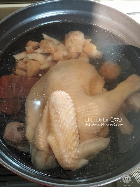 雞,金華火腿及瑤柱放入鍋內加水,水要剛好蓋過材料。水滾後轉小火煲2小時。