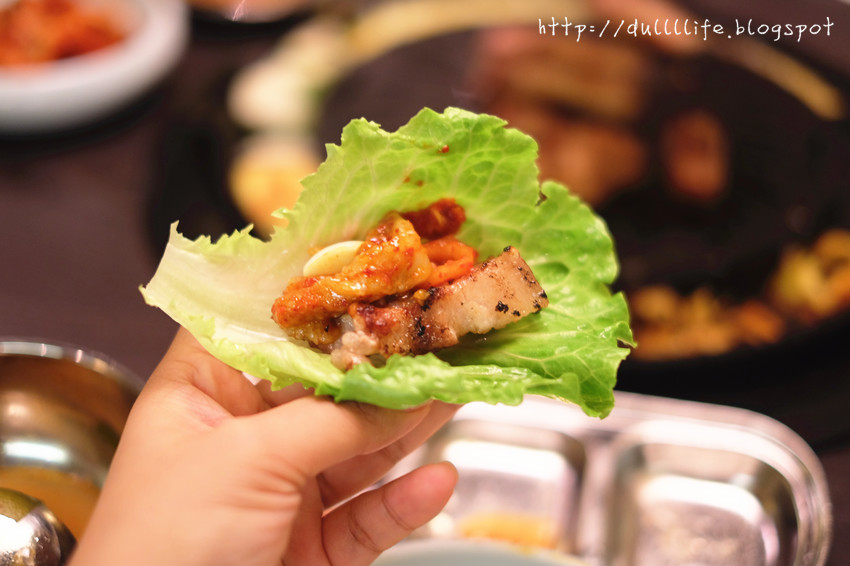 生菜舖上各種泡菜再夾上一大塊肉.記得沾醬喲