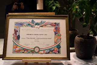 餐廳位於地庫,話就話是高級意大利菜,但是裝修並沒有令人需要屏息靜氣的高雅,淺綠色的梳化,淺啡色的餐檯,與素色的牆身,形成一股簡約而典雅的輕鬆氣氛。