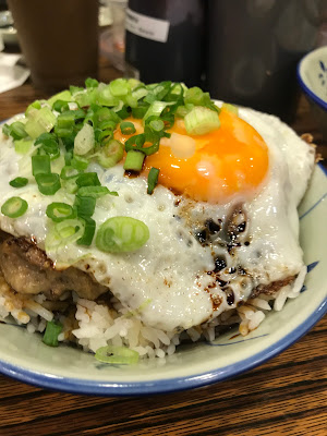 煎得帶濃邊的雞蛋,放在煎肉餅上,預先淋上特製豉油,如不夠的話,檯上有瓶豉油備用。