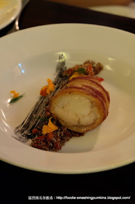 主菜是香煎鮮魚煙肉卷伴有機藜麥魷魚清湯汁,至於是用甚麼魚,要根據當日有甚麼魚。