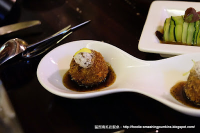 松露野菌意大利飯球釀牛頰肉配黑松露汁,炸得金黃的飯球,輕輕地以舌尖一推,意大利飯粒有如孔雀開屏,連同松露野菌的香氣,輕輕地散發出來。