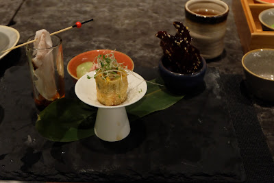 松花口水雞用上清遠雞,雪白的外表凸顯雞件的光滑,吃的時候才沾辣汁,天使魔鬼混合體;豆素卷是四道前菜之中,唯一不辣的代表,輕易地道出川菜並非一味得個霸道,其實是有辣有唔辣之信息,與潘源良音樂會的主題,不謀而合。