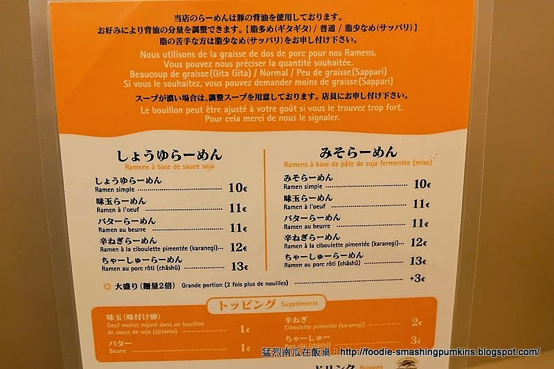 大約可以坐二十人的麵店,我選擇坐吧檯,桌上的餐牌文字,只有日文與法文,憑著一點點漢字,才明白一點點。
