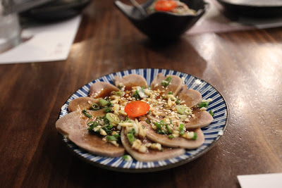 彼此也在捱的日子,拿起斟滿燒酒的杯,一起乾,暫時忘懷平日的一切失落,前菜涼拌山葵牛舌,我就是一吃芥辣就覺得刺鼻的人,忍不住打了噴嚏,還好沒有惹來其他人側目。