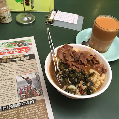 坐下,對侍應說:(雪菜肉絲/沙嗲牛肉通粉/麵,加塊豬扒。)早已成為習慣。
