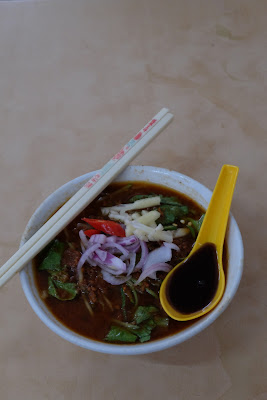 亞參叻沙的靈魂之一:羅望子,其酸味是由它賦予,叻沙葉、洋葱、辣椒等材料,不可或缺;結合出又酸又辣,有些地方會加入蝦膏,增添多一份鹹鮮,藉此提升味道,這裡的叻沙,用搞碎的沙甸魚,我相信連同魚頭一起煮,取其甘苦之味,酸辣鹹鮮帶點甘,豐厚而複雜,辣度直逼頭頂,摸摸頭髮盡濕透。