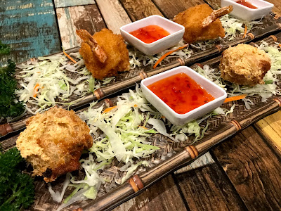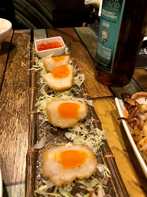 頭盤全是炸物,黃金入球很過癮,墨魚滑加鹹蛋黃炸成球,令我聯想起Scotch egg,香脆彈牙,墨魚滑味道鮮美,蛋黃甘香,沾上泰式甜酸醬,再以R小姐帶來的Speyside威士忌來配,其潔淨的雪莉桶風味,的確又幾夾。 (係個甜酸醬同威士忌產生咗微妙嘅火花。)我們一致認為。