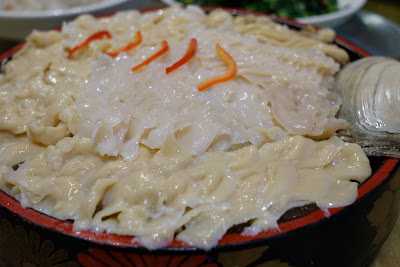 原條象拔蚌刺身,足一斤七両重,切成片堂灼,輕輕地在高湯一揮,味道又爽又甜,我也吃了不知多少片了。