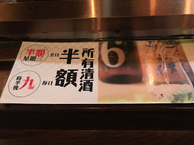 後知後覺,每逢星期三晚九點半後入坐,居酒屋的清酒,一律半價,沒有附帶條件,當然你沒可能淨飲不吃東西,雖然不收雙計。