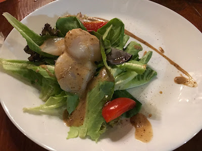 第一道菜為鮮帶子沙律,生勾勾的帶子刺身,質素之高不用置疑,新鮮的沙律菜再配上麻醬,清新惹味兼而有之。