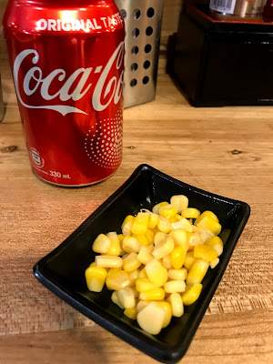 等到拉麵上枱,我的前菜與汽水仍未到,追問侍應之下,原來忘記了,前菜沒有甚麼特別,只是甜粟米。