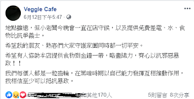 我最常去的素食店,觀塘東廣場的Veggle Cafe,雖沒有參與罷市,但是老闆會為義士們,提供食水,食物,與及手機叉電;記得示威當日,我在Facebook專頁,提議每人用$300,去老麥買漢堡包,從天橋掟下去給示威者,未必走到最前線,也希望為他們作後援。