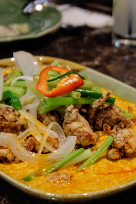 黃咖喱軟殼蟹同樣是令人吃到欲罷不能的主菜,濃而不太辣的黃咖喱伴着炸得香脆的軟殼蟹,吃到要另外叫個薄餅來沾咖喱汁吃,最後則以泰式奶茶班戟配泰式奶茶雪糕作謝幕。