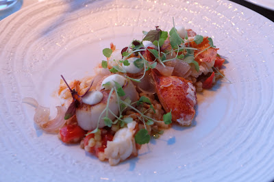另外的主菜要額外加$128,意大利小麥粒配扇貝,龍蝦,花椰菜汁及甜酸蔥片,略略把表面煎香的帶子,肉質鮮嫩,龍蝦的恰好生熟程度更顯爽甜,主角的表演太出眾,底部的煙韌小麥粒,無奈地淪為小配角。