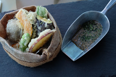 日本野菜天婦羅伴黑松露麵豉紫菜絲汁,當你去日本料理,不論是天婦羅店或放題,當吃天婦羅的時候,通常佐以蘿蔔蓉與醬油,Aqua的大廚想到用加入黑松露的麵豉汁來配,炸得酥化,內裡依然juicy的野菜,沾滿黑松露的香氣,是另一種fusion的姿態。