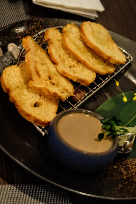 先撇除個人對今天囍帖街的偏見,Blue Brick Bistro的四道菜晚餐售$368,價錢經濟實惠。由頭盤清酒麵豉醬配雞肝多士,麵豉的鹹與雞肝的膩一拍即合,再加上清酒本身的香,這股日式風情實在令人難以抗拒。