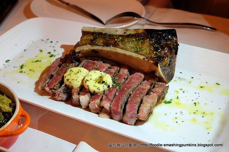 全晚的重頭戲,Grilled USDA Prime Rib eye,連同牛骨髓一起上。切成小件的牛扒,面頭放上香草牛油。