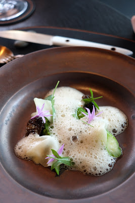 以法國炸薯仔球的原理,融入在充滿和風的北海道帶子,取代了日式天婦羅的手法;薄而酥脆,輕盈不油的黃金表面,包著的是帶有紫菜香氣,肥美鮮嫩的帶子,生熟程度恰到好處,伴碟的是以芹菜頭打成的foam,其清香與炸帶子的熱呼呼,產生了微妙的平衡。