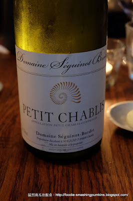 雖不為喝酒而來,既然當晚主要吃海鮮,就聽餐廳經理的意見,來一瓶Chablis啦。沒有說Chablis一定要配生蠔,總之配海鮮便行。