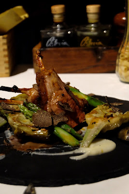 Osteria沿用的是意大利黑松露,酒店餐廳可以不惜工本,此味羊架賣$388,烤得半生熟的羊架,肉質嫩滑不粗,其肉味濃,可是仍欠缺一點羶香;芹菜頭打成茸,原條烤雅支竹,兩者息息相關;一同把羊架的濃味中和,至於黑松露,顯得楚材晉用。