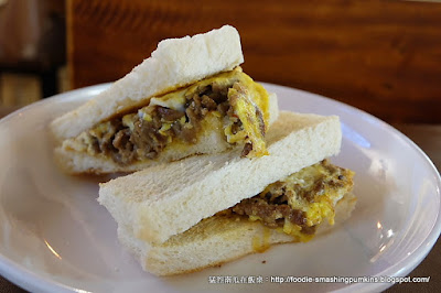 蛋牛治烘底,牛肉有嚼勁,味道濃郁,蛋身香滑兼有蛋汁,與烘得香脆的麵包,水準與新香園不相上下,又或者,可以說是青出於藍。