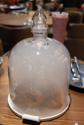 捨和牛取烤雞,事後孔明是正確的選擇,掛上餐廳名字的Roasted Spring Chicken Stuff with Black Truffle,單講賣相已經先拿下最佳外觀獎,玻璃罩下的煙霧正蓄勢待發,甫打開,煙霧瀰漫,待其消散後,原隻烤雞纖毫筆現;我們拍過照之後,侍應便把它一分為四。