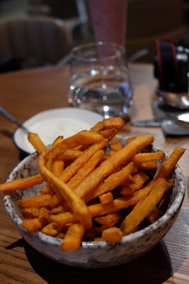主菜的配菜,炸甜薯條配乳酪醬先上桌,侍應說用來送住酒先,香脆帶甜的薯條,沾上乳酪醬,當然談不上邪惡,但有一定吸引力。