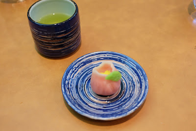主菜是鹽燒櫻鯛、松の子、昆布,現今還未到賞櫻季節,但櫻鯛卻衝閘而出,簡單以鹽燒來處理,凸顯了櫻鯛的細水長流魚香,菇菌的幽香,春筍的甜,昆布的秀氣,再加上松の子的點點甘甜,整道菜的感覺,有如春回大地的朝氣。