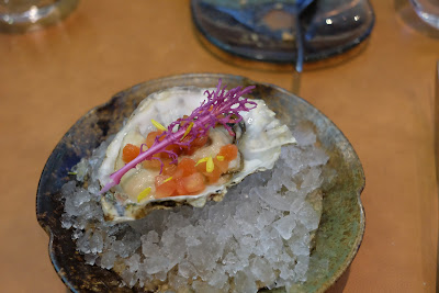 當日中午,我試的是$690四道菜餐單,吃過餐前麵包,仍留戀那一記海苔牛油之際,第一道菜惠比須岩蠔伴油菜花、明太子,飽滿的岩蠔鮮甜不在話下,明太子的鹹香賦予了其精緻的鹹鮮,好了,整隻生蠔送進口裡,慢慢地咀嚼,慢慢地吞下,強烈的礦物氣息餘韻,悠長而歷久不散。