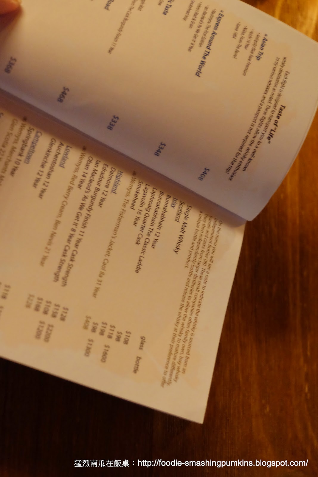 打開酒牌,號稱有過百款威士忌供應,果然,就是過百多一點而已。除了一些大路款式,如麥卡倫格蘭傑格蘭利威之類。。。我最愛的艾雷島,哈哈,只得一些標準款,連ArdbegKilchomanBowmore也沒有。。。老實說,我是有少少失望。