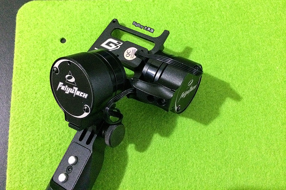 兩個bushless馬達控制攝錄機水平,及俯仰移動。兩個馬達背後有LED燈,顯示馬達狀態,但說明書好像沒有寫明如何閱讀啊。馬達部分跟手柄部分之間有個關節位,關節位可以調教角度,透過螺絲收緊。