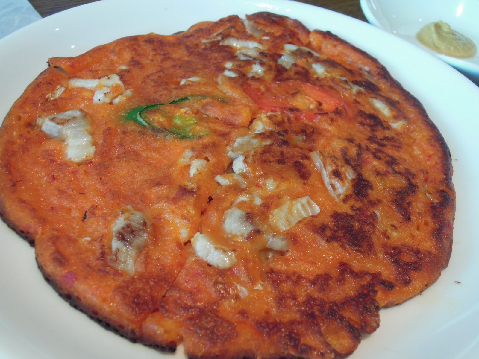 海鮮煎餅:其貌不揚,就是扁身橙色的一塊,但是挺精彩的,釀在餅內,加强了口感,咬下去餅身也有點糯性。