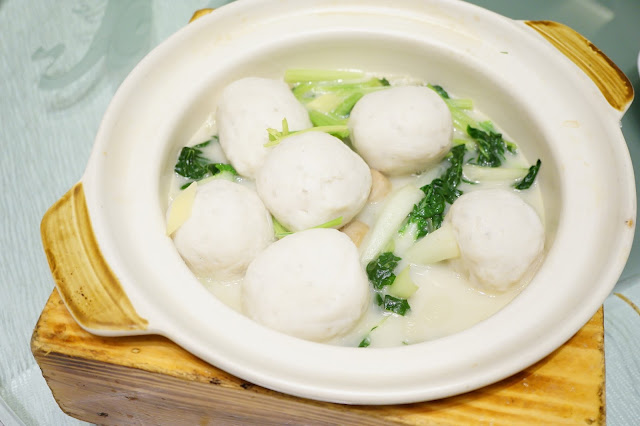 魚湯手打魚腐浸時蔬:光看那比乒乓球還要大的魚腐,是有點嚇到的(還有兩顆呢..)豈料咬下去竟是如此鬆化,好吃! 是向來不怎麼吃魚腐的我也覺得好吃呢~
