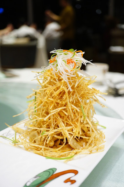 金絲脆腰果 (新菜式): 這真是讓人嘖嘖稱奇的手工菜,切得幼如絲而炸得不油身的悅口小食, 淋上蜜糖是令嘴內多了一分香甜,還以腰果墊底,大讚!