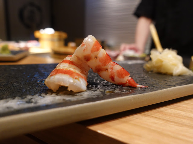 來自鹿兒島的花竹蝦紋理清晰,煮成 3成熟,把少量的飯釀進蝦底,是新穎的好選擇~