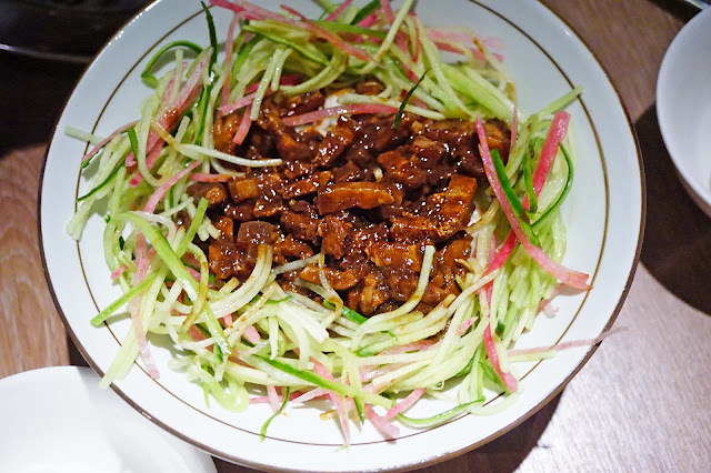 主食類的烤醬麵,跟平常吃到的賣相很不一樣,是展現了中西合璧的精神吧! 炸醬麵是一件件的肉粒,加配大量青瓜絲,麵條挺彈牙的,正好展現另類的風采~