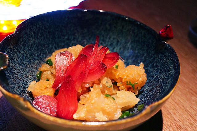前菜是兩款經典的小食,前者在燈光的映照下是分外的美~海蜇頭的體積比想像中要大一點,切了花,微帶麻油香,相當爽身。