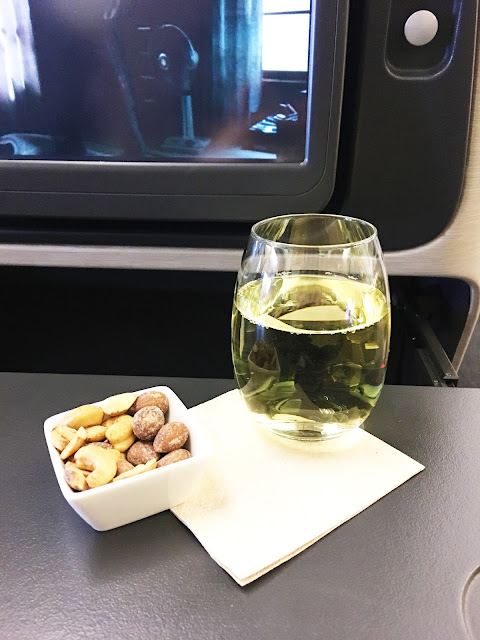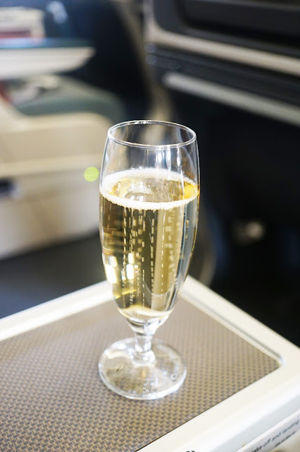 先來的是空姐會遞一下歡迎飲料,當然要喝一杯香檳吧!再以熱毛巾刷刷手,美好的旅程就由此開始吧。