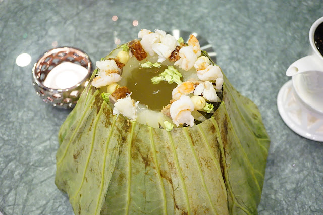 瓊姿玉露近合甫:據了解這個可是得獎名菜—是2016年美食之最金獎菜式,論顏色和擺盤也是帶一分神秘的美感。那看起來像芋角的原來匿藏着一顆通透的鴿蛋。