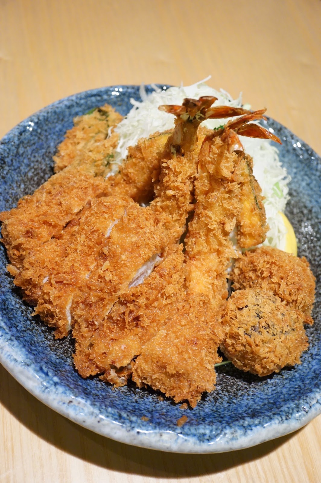 吉列豚肉拼盤: 吉列熊本豚, 吉列蝦,吉列香菇免治豚,吉列南瓜,吉列青椒: 當天品嘗了兩款的吉列拼盤,這是其中一款。最亮眼的是吉列豚肉,皮炸得香脆,肉質挺有彈性的。南瓜也是做得相當不錯的呢。