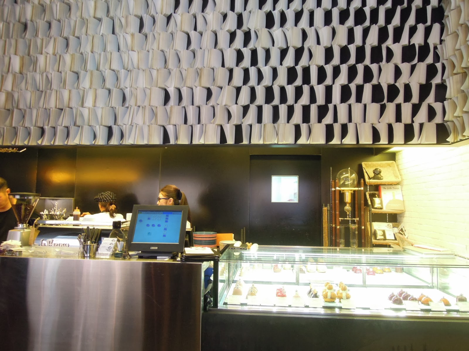 人氣的店,也是值得要等一下的。那個餅櫃其實也真太吸引了,琳瑯滿目,是女生也會喜歡吧,每一個甜點也配了很有氣質的名字,還有引人入勝的簡介,真沒有不喜歡的道理。而且牆上的一處是由很多本黑色記事本堆砌而成的, 玩味十足。