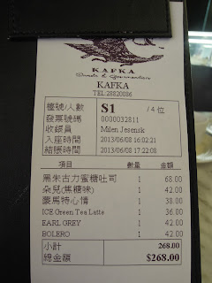 為了到卡夫卡,其實真的近乎不惜一切。沒有預先找 到地圖,就到官也街Starbucks外用wifi找地址,又在烈日當空下步行半小時到目的地,在團團圓C領導下很順利,實在有功。到達目的地後,其實還 是一片疑惑,眼前就是民居而已,後來才知道原來那間毫不起眼,黑色門面的店就是 卡夫卡了, 真夠低調。