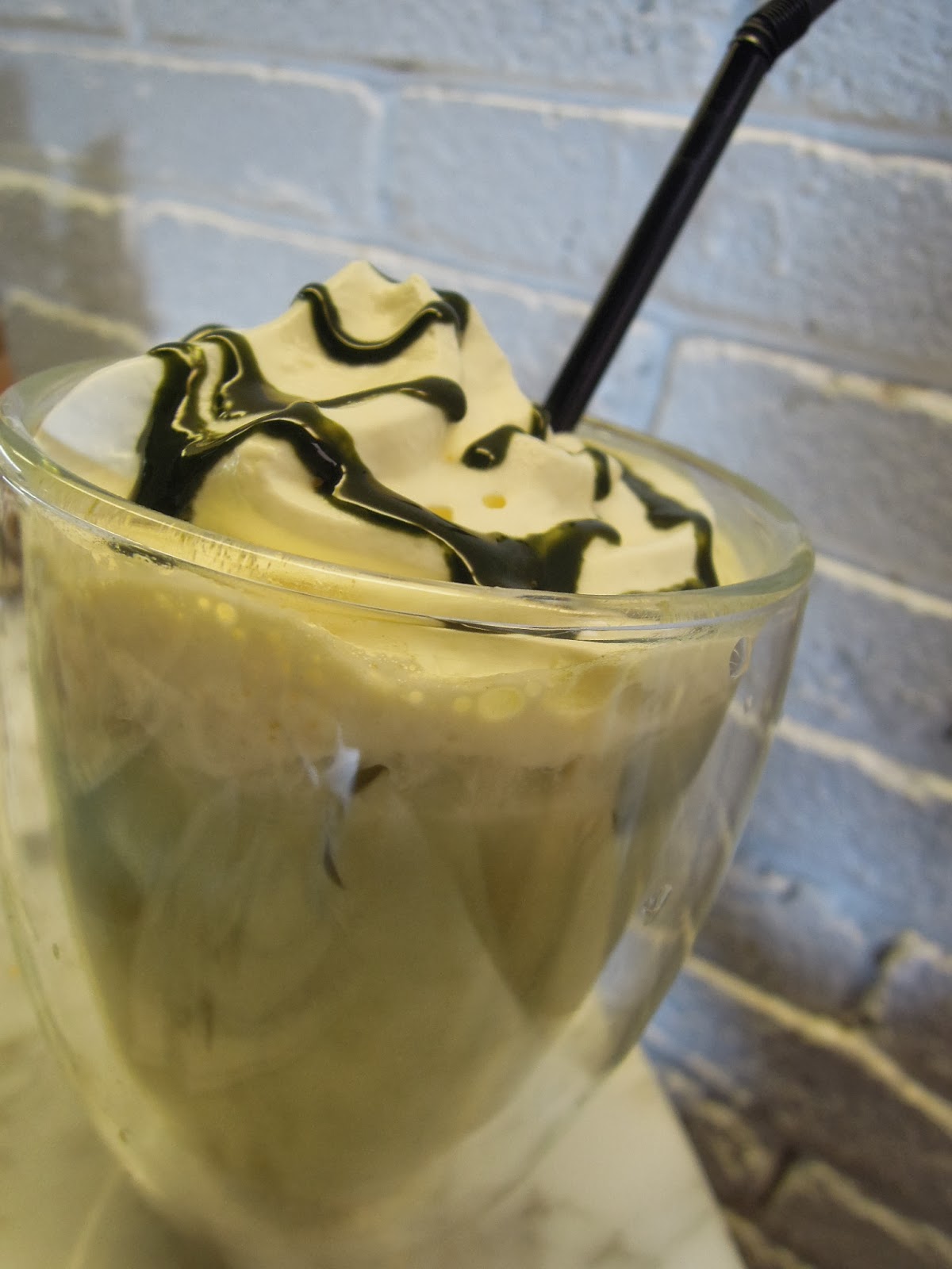Ice green tea latte: 看見有不少食客也點這個了, 愛抺茶的我就是吃得飽也不要錯過! 從餐牌上看到兩款抺茶的飲料, 結果就點了這款Ice green tea latte, 顏色是比想像中要淡的, 頂層是有白色的奶油, 再擠上巧克力醬氹氹轉的。誠然, 抺茶味不怎麼突出, 而且就是入口很淡的一杯飲料, 加了忌廉也補不回來, 可惜...